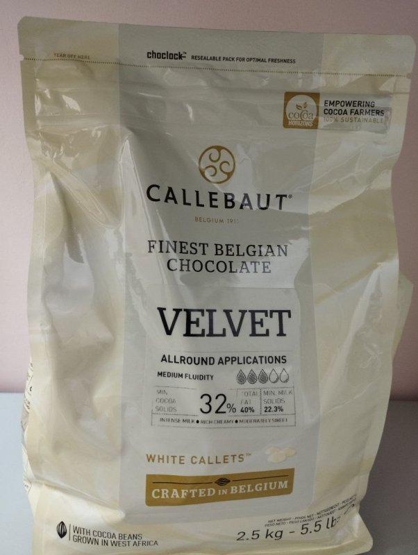 Удобная большая упаковка шоколада, если вы работаете в больших масштабах или просто очень любите белый шоколад. Если сравнивать различный шоколад, то вельвет идеально подходит по всем показателям. Плюс ко всему он очень вкусный. Легко плавиться и темперируется.