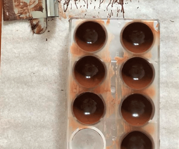 - когда останется небольшая часть не размешанных каллет, прекратите греть шоколад и промешайте его до однородности;