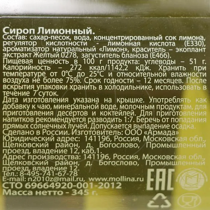 Доставка Сироп Mollina "Лимон" 345 г из магазина в вашем городе: