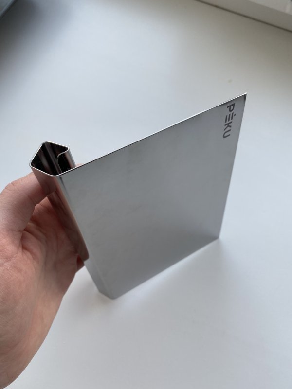 Шпатель очень качественный, металл прочный (как у колец для выпечки данного бренда). Единственный минус - это неровное основание ручки. Это видно на фото, где я сверху придерживаю пальцем. Если выравнивать торт правой рукой и поставить шпатель на стол, то он упадёт. Другой стороны край ровный. Данный нюанс не отражается при работе с тортом, но стоит привыкнуть(