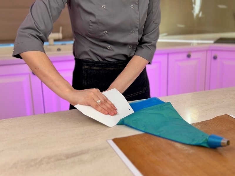 Использую этот скребок для вспомогательных целей: идеальный помощник для подгонки теста и кремов к носику мешка, чисто и без потерь. Лучше всего использовать именно пластиковый, так как железные шпатели цепляются углами и рвут мешки.